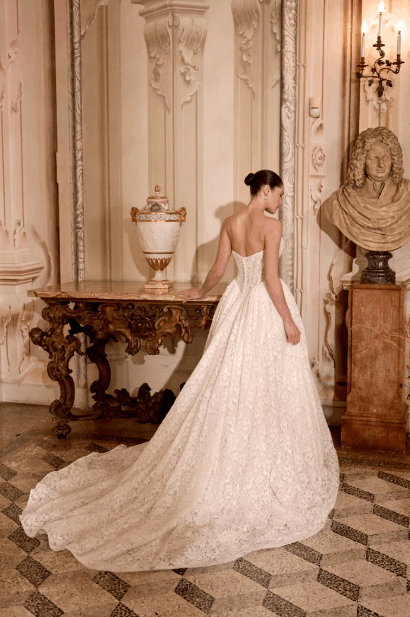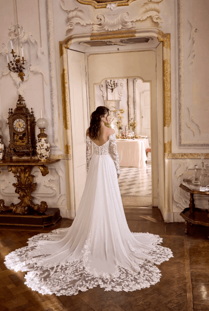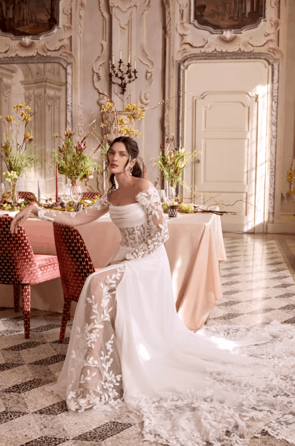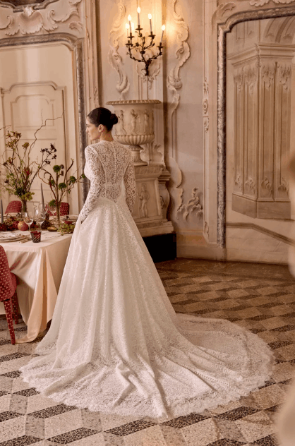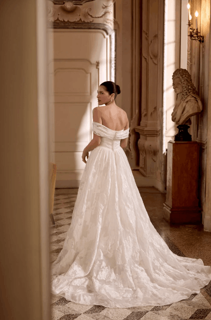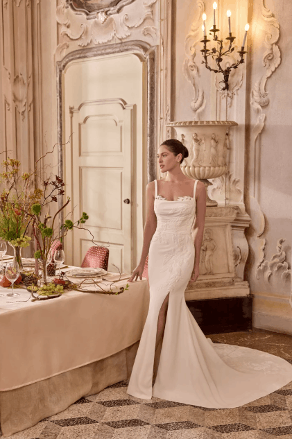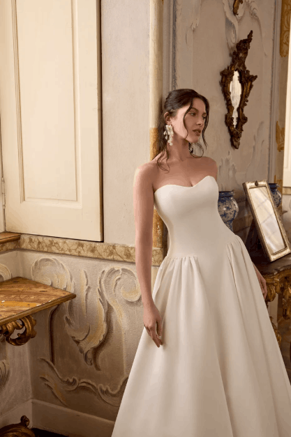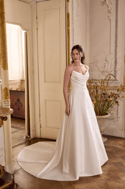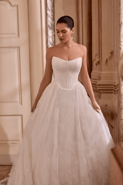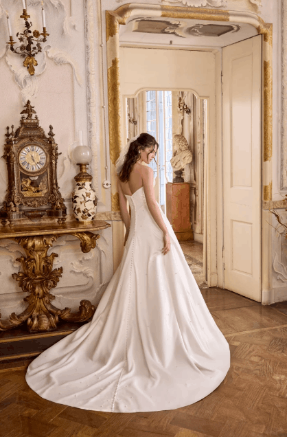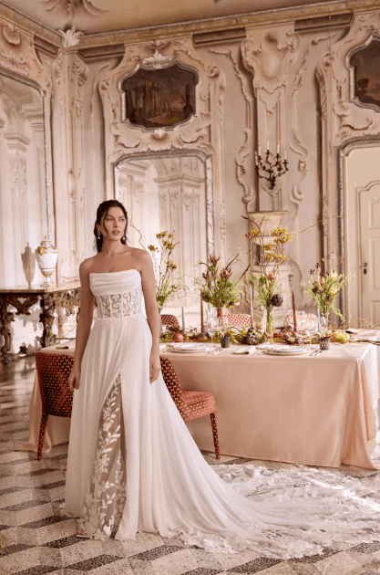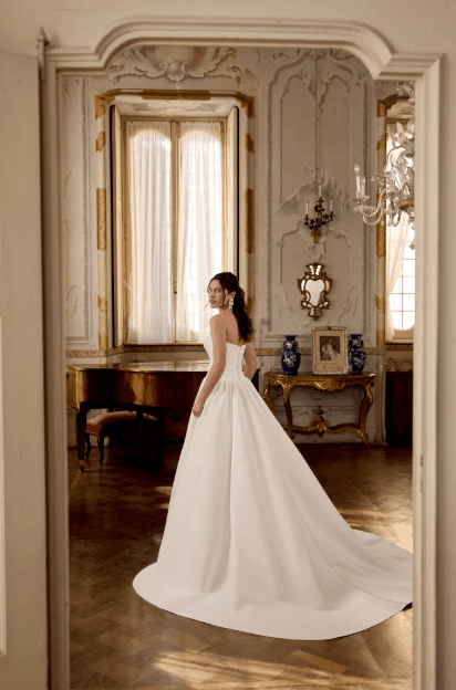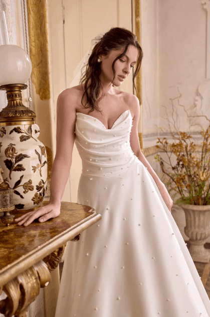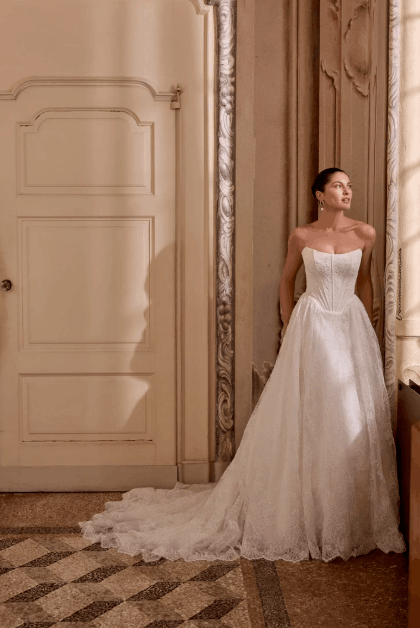 This collection blends clean, modern lines with exquisite detailing. With sculpted silhouettes and eye-catching embellishments, this collection is for the confident bride who embodies both grace and boldness.